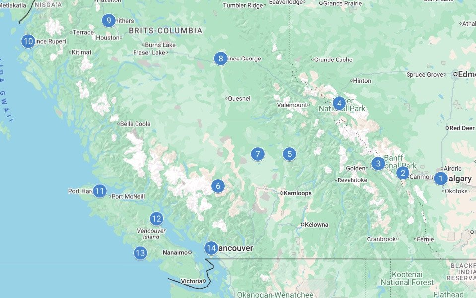 Verder noordwaarts passeer je plaatsen als 100 Mile House, Prince George en Smithers, waar uitgestrekte bossen en rivieren het landschap domineren. In Prince Rupert bereik je de Pacifische kust en vaar je door de spectaculaire Inside Passage, een van de mooiste fjordroutes ter wereld. Daarna ontdek je Vancouver Island, met ruige noordelijke landschappen rond Port Hardy en de natuurlijke schoonheid van Campbell River, voordat je de oceaansfeer opsnuift in Tofino. De reis eindigt in het levendige Vancouver, waar stad en natuur harmonieus samenkomen en deze indrukwekkende rondreis door West-Canada perfect wordt afgerond.